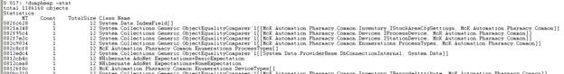 Now that you are all set up, the first thing you want to check is the relative amount of space used by different .Net objects. To do this, execute a !dumpheap –stat command: