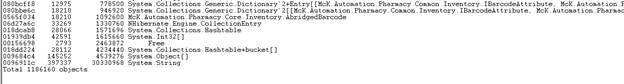 All of the objects in the heap are listed by their class, in order from least memory usage to greatest, for the object class. It shows the number of instances (count) and the total size of those instances (TotalSize). Note that this is a shallow size – the memory consumed by the object itself, not any child objects it holds. This can be quite deceiving, but it is a good starting point.